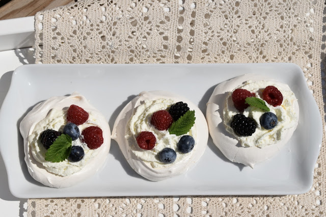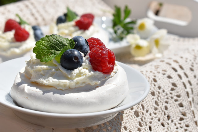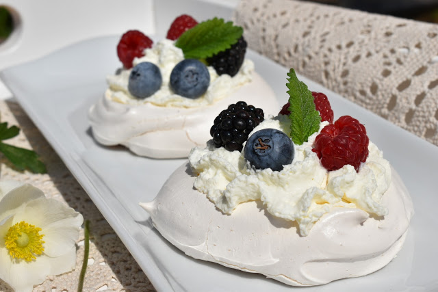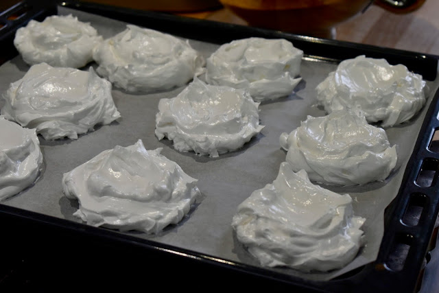 Vložte do trouby a snižte teplotu na 120-110 °C, pečte asi 40-45 minut na spodní mřížce, během pečení troubu neotvírejte. Horkovzduch nepoužívám. Pavlova by měla být na povrchu křupavá a uprostřed vláčná, to je způsobeno přidáním škrobu. Po upečení troubu vypněte a nechte v ní dortíčky úplně vychladnout. Po vypnutí trouby malinko pootevřu dvířka, vložím do nich vařečku a nechám upečené pavlovy dojít, dokud úplně nevychladnou.