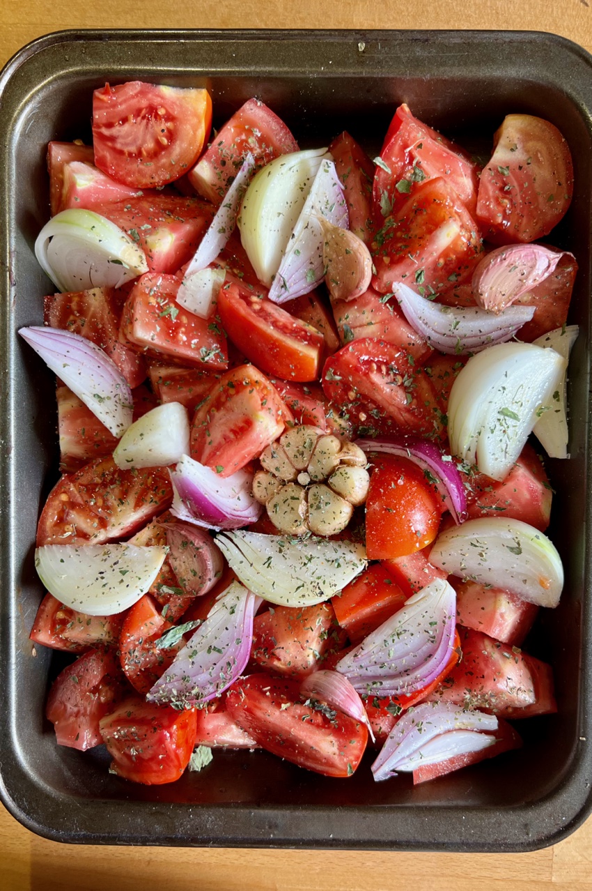Rajčata rozkrojte dle velikosti buď na půlky nebo na čtvrtiny a dejte do pekáčku. Cibuli oloupejte, nakrájejte na menší kousky, česnek rozeberte na jednotlivé stroužky, ale neoloupejte je a vše přidejte do pekáčku k rajčatům. Posypte oreganem, čerstvě mletým pepřem, osolte a pokapejte olivovým olejem.