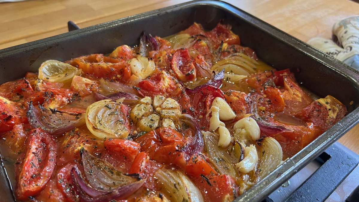 Pečte v předem nahřáté troubě na 200 °C asi půl hodiny nebo dokud nejsou rajčata měkká a lepkavá.